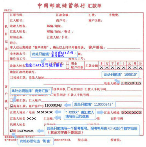 (邮编:100010,收款人:北京市ATA公司期货报名,汇款方式:商务汇款,商户客户号:110000343)