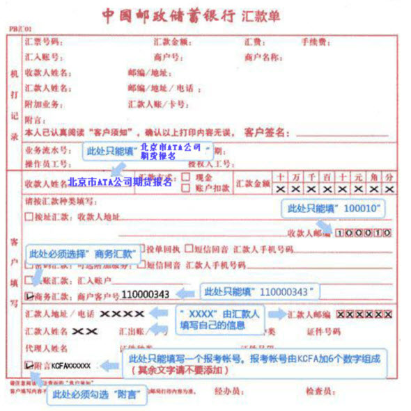 (邮编:100010,收款人:北京市ATA公司期货报名,汇款方式:商务汇款,商户客户号:110000343)