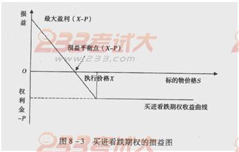 ③买进看跌期权:看跌期权的买房在支付一笔权利金P后,有权在到期日之前按照合约规定的执行价格X向看跌期权的卖方卖出一定数量的期权标的物。