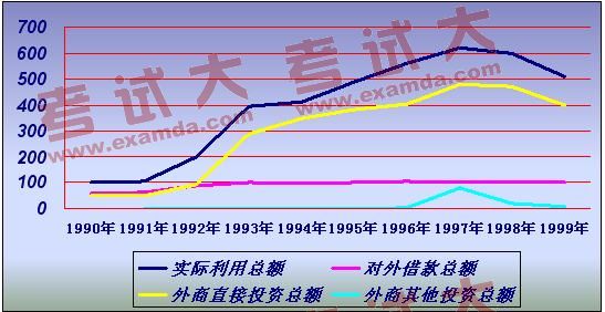 从图5-4可以看出,1990年以来,中国利用外资的规模迅速扩大,1999年实际利用外资总额是1990年的5倍多。在图中的深蓝色的线是实得利用外资总额,1990年约100亿美元,到1999年约为500多亿美元。