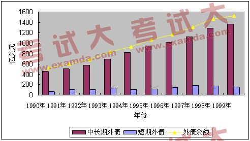 由图5-5可看出,中国外债增长幅度较大,外债规模不断扩大,从图中我们看到,外债余额一直呈增长势头。1999年外债余额相当于1990年余额的近3倍,从图中可以估计出1999年外债余额约1500亿美元,1990年约500亿美元。