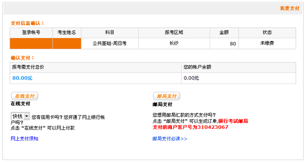 如选择“邮局支付”则进入支付确认页面,按照系统提供的样张至邮局使用“中国邮政普通汇款单”进行汇款,务必在附言栏填写报考账号。