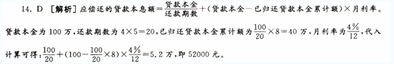 16.B[解析]等额本金还款法偿还本金的速度最快,因而整个还款过程中承担的利息最少;一次性还本付息法偿还本金速度最慢,承担的利息最多;等额本息还款法则是居于等额本金与到期一次性还本付息之间;组合还款法则因为还款期数、每期还款额不同,负担的利息额视具体情况不同。