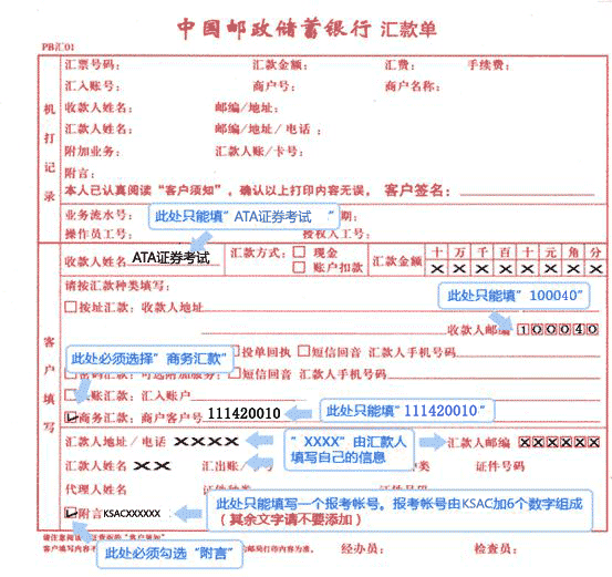 1、邮局汇款汇到考试机构ATA公司的考试报名缴款专用客户号(邮编:100040收款人:ATA证券考试;商务汇款:商户客户号:111420010)(该商户客户号是本次证券考试邮局支付方式唯一接受报名款项的地方,除此之外,不接受其它任何缴费方式,如异地电汇、上门缴款等),邮局可接受支票付款进行邮汇。请务必在汇款时正确填写收款人邮编:100040,商户客户号:111420010