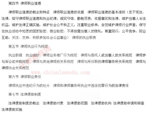 熟悉并能够运用:律师的权利义务,律师执业行为的基本规范、律师职业责 任的规定,法律援助制度的主要内容。