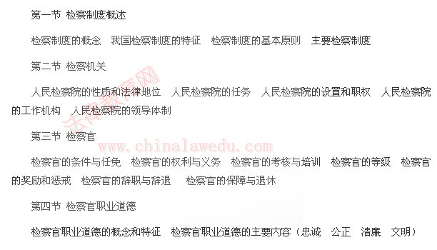 了解:检察制度的概念和特征,人民检察院的性质、任务、设置和职权,检察 制度的基本原则,主要检察制度'检察官职业道德的概念和特征。