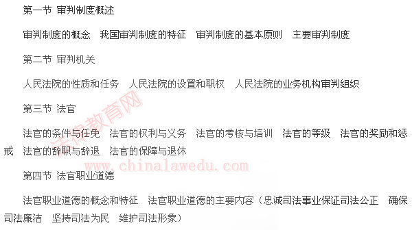 了解:审判制度的概念和特征,人民法院的性质、任务、设置和职权,审判制度的基本原则,主要审判制度,法官职业道德的概念和特征。