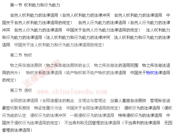 结婚的法律适用(结婚实质要件的法律适用 结婚形式要件的法律适用中国关于结婚法律适用的规定) 夫妻关系的法律适用(夫妻人身关系的法律适用 夫妻财产关系的法律适用 中国关于夫妻关系法律适用的规定) 离婚的法律适用(离婚案件的管辖权 离婚的法律适用 中国关于涉外离婚的规定)父母子女关系的法律适用(中国关于父母子女关系法律适用的规定) 收养的法律适用(收养成立的法律适用 收养效力的法律适用 收养解除的法律适用 中国关于收养法律适用的规定) 扶养的法律适用(中国关于扶养法律适用的规定) 监护的法律适用(中国关于监护法律适用的规定)