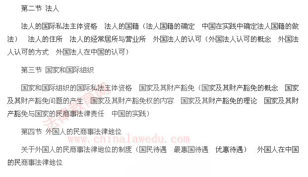 熟悉并能够运用:自然人国籍的积极冲突和消极冲突及其解决,自然人住所的积极冲突和消极冲突及其解决,自然人和法人的国籍、住所、经常居所、营业所的确定,外国法人的认可规则,国家及其财产豁免制度以及关于外国人的民商事法律地位的制度。