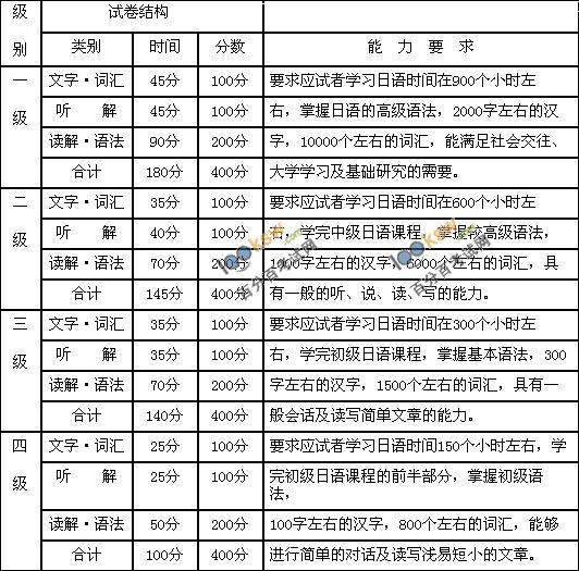 答:考试分一、二、三、四共四个级别,一级约相当于我国大学本科专业日语 3 ~ 4 年级的水平。每个级别的考试又分文字词汇、听力、阅读语法三部分。要求详见下表,考生可根据自己的情况报考相应的级别。