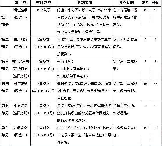 A、B、C三个等级的考试各由6个部分组成,每个级别的考试题型一样、题量相同,但不同级别考试总的阅读量及难易程度不同。考试主要考查应试者理解书面英语的能力。