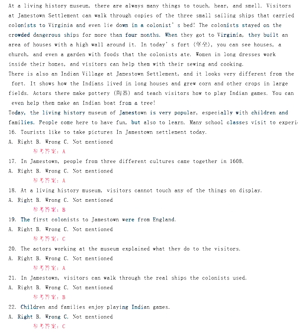 A woman in Native American clothes is sitting in the sun, sewing a dress from skin. Inside a building, a colonist is making a wooden chair, using very simple tools. And all around, tourists are taking pictures with their digital (数码的) cameras. This is Jamestown Settlement today.