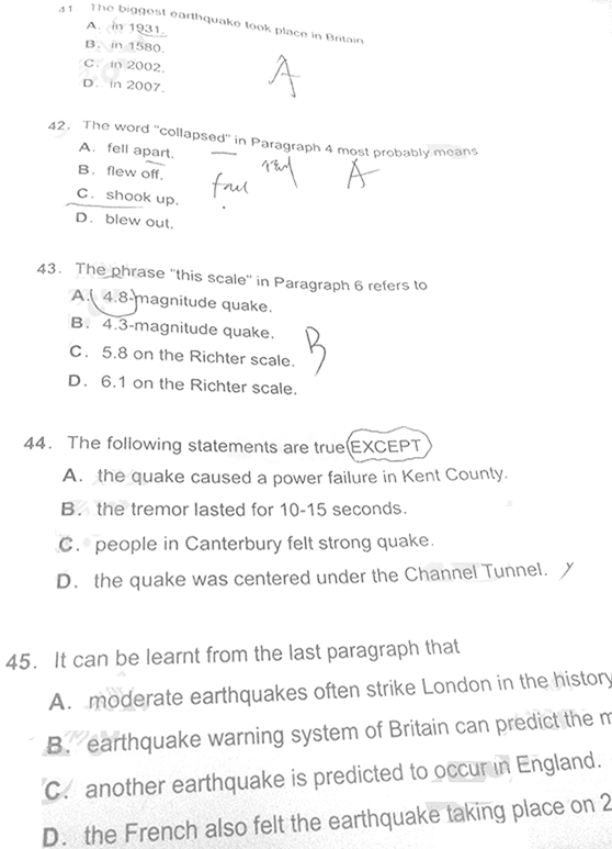 第三篇 原文出处阅读判断第七篇Moderate earthquake strikes England