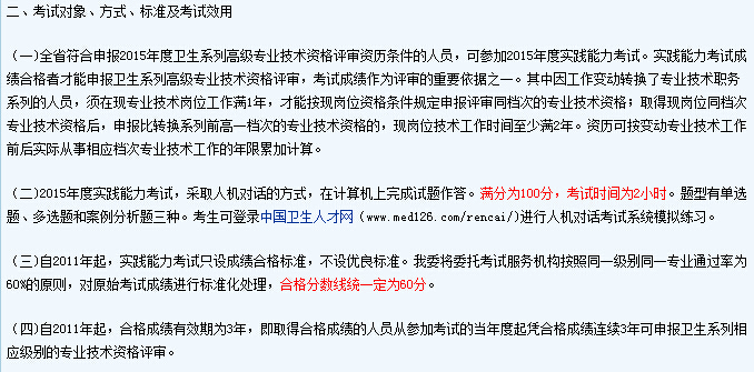 根据《广东省人事厅 广东省卫生厅关于改革和完善卫生系列高级专业技术资格评价方式的通知》(粤人发〔2005〕311号)和省人力资源社会保障厅《关于卫生系列高级专业技术资格实践能力考试有关问题的复函》(粤人社函〔2011〕522号)精神,为做好2015年全省卫生系列高级专业技术资格实践能力考试(以下简称实践能力考试)工作,现将有关事项通知如下: