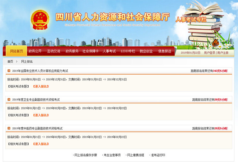 我省2019年度卫生、中医药专业副高级技术资格考试全部实行网上报名、网上缴费、现场资格审查和现场打印发票。报考人员须在规定时间内登录四川省人力资源和社会保障厅官网(www.sc.hrss.gov.cn)“人事考试”专栏(新用户需先进行网络注册),并认真阅读有关文件,了解有关政策规定和注意事项等内容后,根据本人的实际情况进行报名。