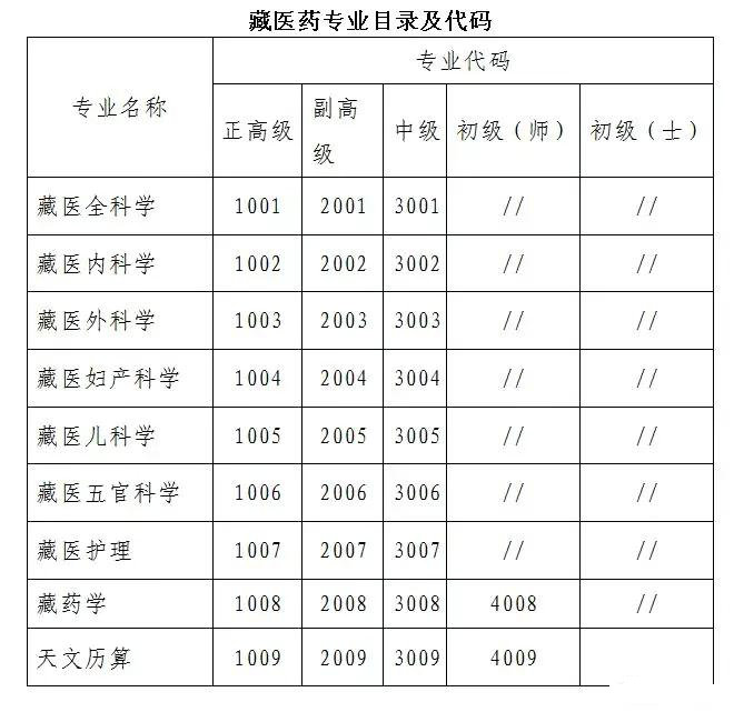 考试科目分西医(含中医)和藏医(含藏药、藏医护理、天文历算)两个科目。其中西医分正高、副高两个级别;藏医和藏医护理分正高、副高、中级三个级别;藏药、天文历算分正高、副高、中级、初级(师)四个级别。(专业目录见下文)