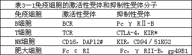 1 .分子水平的免疫调节:通过 PTK 参与的激活信号转导和 PTP 的负反馈调节。免疫细胞激活信号转导中的两种对立成分 ( 蛋白质的磷酸化和去磷酸化、蛋白酪氨酸激酶 PTK 和蛋白酪氨酸磷酸酶. PTP) 和两类功能相反的受体 ( 激活性受体——带有 ITAM ——招募: PTK ——启动激活信号转导;抑制性受体一带有 ITIM ——招募 PTP ——抑制激活信号转导 ) ,其调节作用通过信号转导实现 ( 信号转导涉及蛋白质磷酸化和脱磷酸化,分别由 PTK 和 PTP 促成细胞激活中的一组对立成分 ) 。其中抑制性受体有: