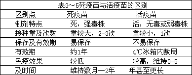 (2) 减毒活疫苗:用减毒或无毒力的活的病原微生物制成 ( 特点:无毒性或毒力减弱,保留增殖能力和免疫原性 ) 。死疫苗与活疫苗的区别见表 3 ~ 5 。