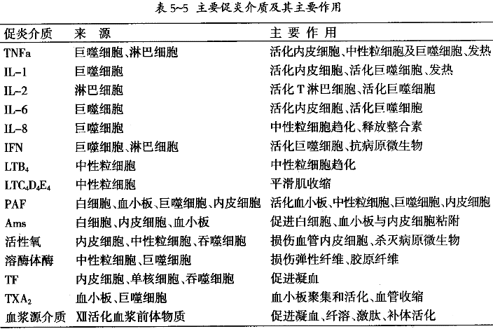 各种感染与非感染性因子可直接或间接地引起机体组织细胞损伤。活体组织对损伤的一系列反应中突出的表现之 - 是炎症反应。一般来说,炎症局限在局部组织中,活化的炎症细胞释放的炎症介质一般仅在炎症局部发挥防御作用。然而,在 MODS 时,炎细胞激产生的多种促炎细胞因子往往又可导致炎症细胞进一步活化,两者常互为因果,形成炎症瀑布反应,通过自我持续放大的级联反应产生大量促炎介质。炎症反应失控表现为播散性炎症细胞活化和炎症介质泛滥溢出到血浆,并在远隔部位引起全身性炎症。 1991 年美 国胸科 医师学会和危重病医学会联合会议上提出了全身炎症反应综合征 (SIRS) 这一名词,指因感染或非感染病因作用于机体而引起的失控的自我持续放大和自我破坏的全身性炎症反应临床综合征。引起 sIRS 的主要促炎介质见表 5 ~ 5