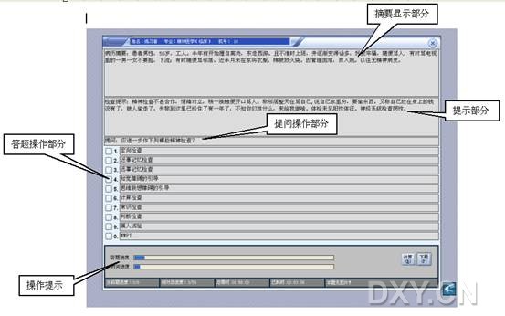 (1)摘要显示部分:摘要显示位于屏幕上部,一般用于显示所考案例描述性文字,如同临床医学题型为“病例摘要”,摘要在本案例的提问没有结束之前始终存在,以便随时为考生提供信息。当下一案例题出现时其自动消失。