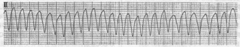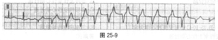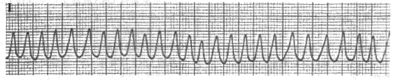 | 正确答案:1.;2. 解题思路:该ECG见QRS波群宽大畸形,节律绝对不整齐,无明确的P波,故初步诊断为房颤心律,QRS波群宽大畸形的原因可能有旁道前传、束支传导阻滞及室内差异性传导几种情况,考虑本患者既往心电图提示为A型预激综合征,且心动过速时心电图的QRS波群方向与预激波方向相同,本图心室率极快,可见艿波,提示为旁道前传,如房颤通过房室结下传,由于在房室结内发生隐匿性传导,心室率一般不会如此之快。由于心动过速时心室率极快,患者血压60/30mmHg,提示血流动力学不稳定,这种情况下可能演变为室颤而出现阿一斯综合征,必须做紧急处理,首选同步直流电复律,而静注西地兰或异搏定有缩短旁道不应期而进一步加快心室率的可能,一般宽QRS博心动过速时应慎用。预激综合征患者旁道前传不应期一般较长,长于房室结不应期,而少数患者旁道不应期很短,房颤时可从旁道前传而引起极快的心室率,并容易引起室颤,临床应引起注意。一般房颤时伴有宽大QRS波,心室率>200次/分时应考虑旁道前传的可能。 |