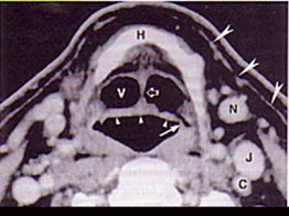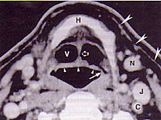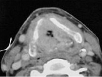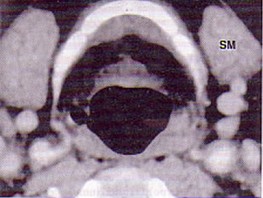 | 男,55岁,声嘶6年,有长期吸烟史。检查:无呼吸困难。喉镜检查:声带慢性充血,可见右侧声带可见菜花样新生物,右侧声带活动固定,喉部CT检查如下图: |