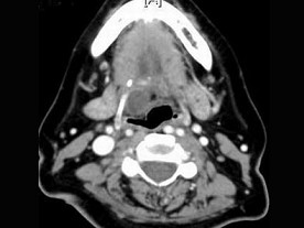 | 患者,女性,28岁,发热头痛4天,伴咽旁和颈部剧痛,吞咽困难,吐字不清,查体:扁桃体及咽侧壁突向咽腔,但无明显充血,张口困难,牙关紧闭: |