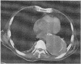 患者男性,45岁。突感胸骨后疼痛来院就诊。行胸部CT平扫发现主动脉增宽,内膜钙化影向内移位超过1.0cm。如下图:![]() |