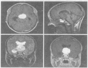4.男,17岁,视力下降,头痛嗜睡4个月,MRI平扫及增强扫描,最可能的诊断为![]() |