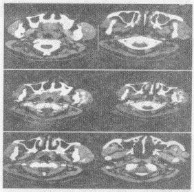 5.女,14岁,发现左侧耳前肿大3个月余,PE:左颊部耳前弥漫性隆起,无压痛,CT如图所示,最可能的诊断是![]() |