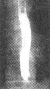 患者,男性,65岁,出现进行性吞咽困难,偶出现胸骨后疼痛。行食道吞钡检查如图。![]() |
