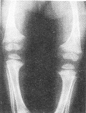 患儿女性,2岁,睡眠差、哭闹、易出汗;双腿呈"O"形。X线平片如图所示。![]() |