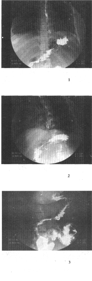 2.女,23岁,反复上腹部疼痛伴黑便2年余,呕吐3天。有血吸虫病史,曾行脾脏切除。结合图像,最可能的诊断为![]() |