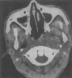 1.男性,50岁。涕中带血丝1个月余,无发热及咽部肿痛。CT检查见图所示,应首先怀疑以下何种疾病