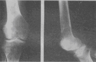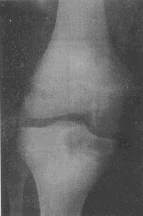 4.男,17岁。右膝关节疼痛1个月余,轻度肿胀。X线片示胫骨近端圆形骨质破坏(如图),应考虑的诊断是