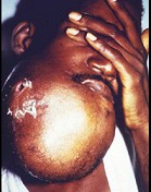 | 患者男性,36岁。右侧下颌区无痛性肿胀逐渐加重八月,无疼痛及麻木感。检查见面部不对称,右侧下颌区膨隆。表面皮肤色、温正常。口内相应区域移行沟丰满,触诊有乒乓球感,穿刺可抽出褐色液体,显微镜下未见胆固醇晶体。 |