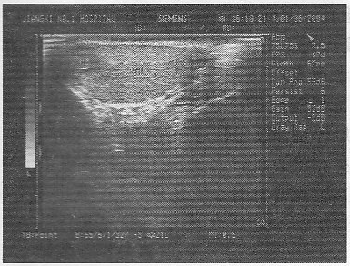 3.某患者5日前阴囊碰伤,现感右侧阴囊不适,超声声像图如下,最可能的诊断为