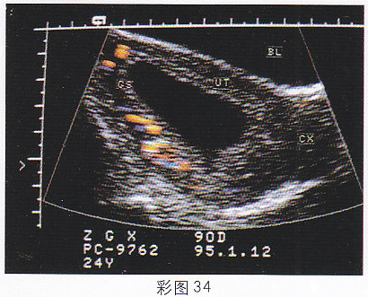 1.女,25岁,停经55天,腹痛、阴道出血1周。尿妊娠试验阴性。结合超声图像(彩图34),最可能的诊断为![]() |
