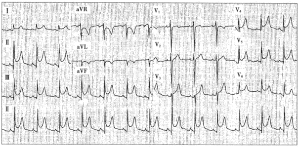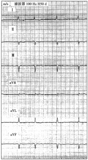 2.患者男性,40岁,扩张型心肌病。心电图如下图所示,与该心电图表现不符合的诊断是![]() ![]() |
