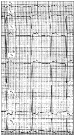 患者男性,35岁,因胸痛、咳嗽2天就诊,急查心电图如下图所示。心肌坏死标志物正常,超声心动图提示少许心包积液,临床诊断为急性心包炎。![]() |