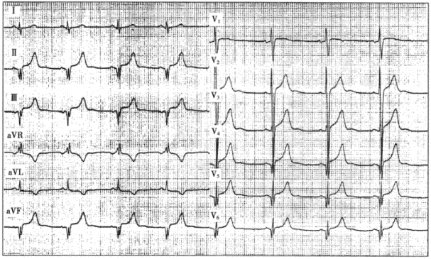 患者男性,25岁,因胸痛、气短半年就诊。血压120/75mmHg,胸骨左缘3~4肋间闻及2/6级收缩期杂音。超声心动图提示室间隔厚度为20mm,左室后壁厚度为9mm,EF值为68%。临床诊断为肥厚型心肌病(室间隔肥厚型)。患者的心电图如下图所示。![]() |