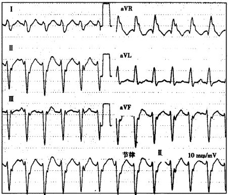 患者男性,29岁,反复发作心悸7年。此次因突发心悸就诊,心电图如下图所示。![]() ![]() |