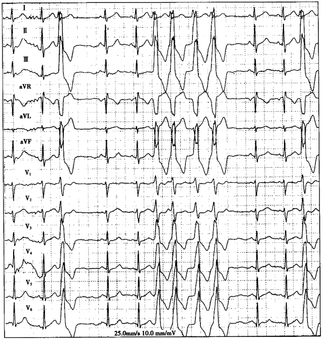 5.患者女性,60岁,冠心病。突然晕倒伴意识丧失,立即记录心电图如下图所示,应诊断为![]() |