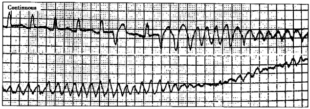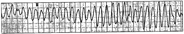 | 正确答案:D 解题思路:心电图可见大幅度的波动波,频率为260次/分,不能辨认QRS-T波,符合心室扑动的心电图表现。 |