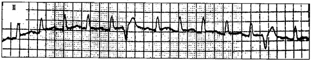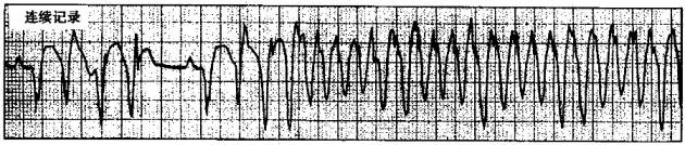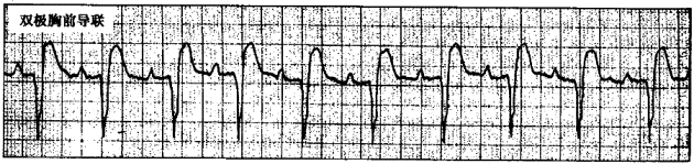 | 正确答案:E 解题思路:心电图可见数个提前出现的宽大畸形QRS-T波群,其R波落在前一个窦性激动的T波上(R on T现象),第4个室性期前收缩诱发出室性心动过速、心室颤动。 |