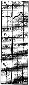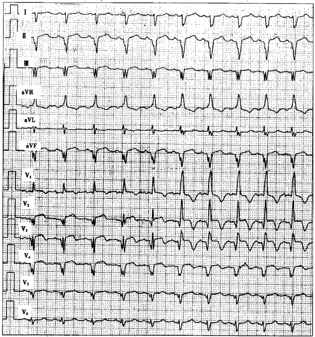 1.患者女性,61岁,冠心病。因突发胸痛2小时就诊,心电图如下图所示,应诊断为![]() |