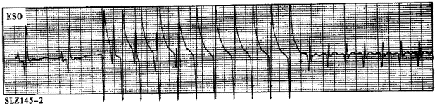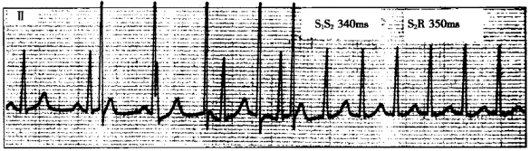 患者男性,18岁,反复发作心悸5年。食管心房调搏检查记录到图4-7-8和图4-7-9。![]() ![]() ![]() ![]() |