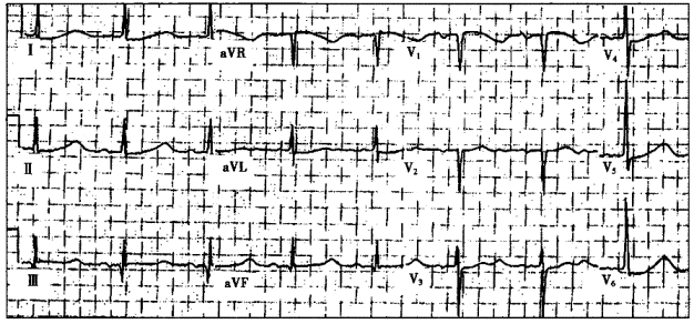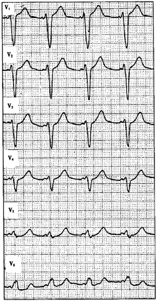 5.患者男性,67岁,高血压病史8年,长期口服利尿剂降压治疗。心电图如下图所示,应诊断为![]() |
