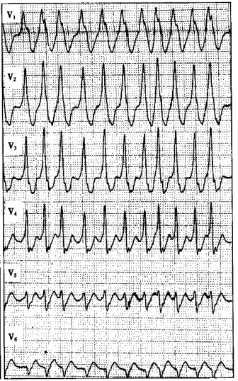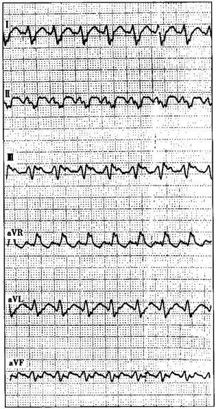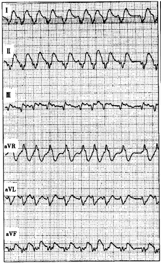 3.患者男性,38岁,因突发心悸、头晕1小时就诊。既往心电图检查提示为A型预激综合征。查体:血压为70/40mmHg,心界不大,无杂音。心悸时记录的心电图如下图所示,最可能的诊断是![]() ![]() |