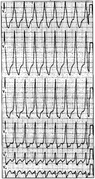 | 正确答案:E 解题思路:心电图特征为:宽QRS波群心动过速,心室律绝对规则,因而可以排除心房颤动合并室内差异性传导及预激综合征合并心房颤动;未见心室夺获及室性融合波;仔细观察Ⅱ、aVF、V5导联可见大小、形态一致的扑动波,频率为300次/分,QRS波群起始部可见delta波,心室率为150次/分,应考虑为预激综合征合并心房扑动(2:1下传)。该病例的诊断经电生理检查证实。 |